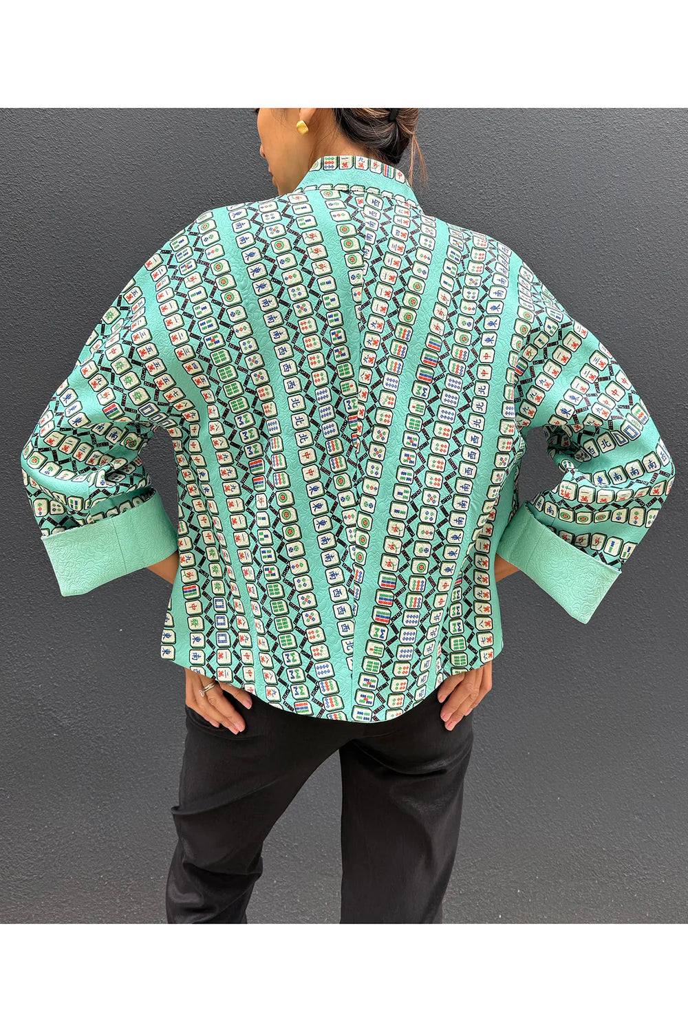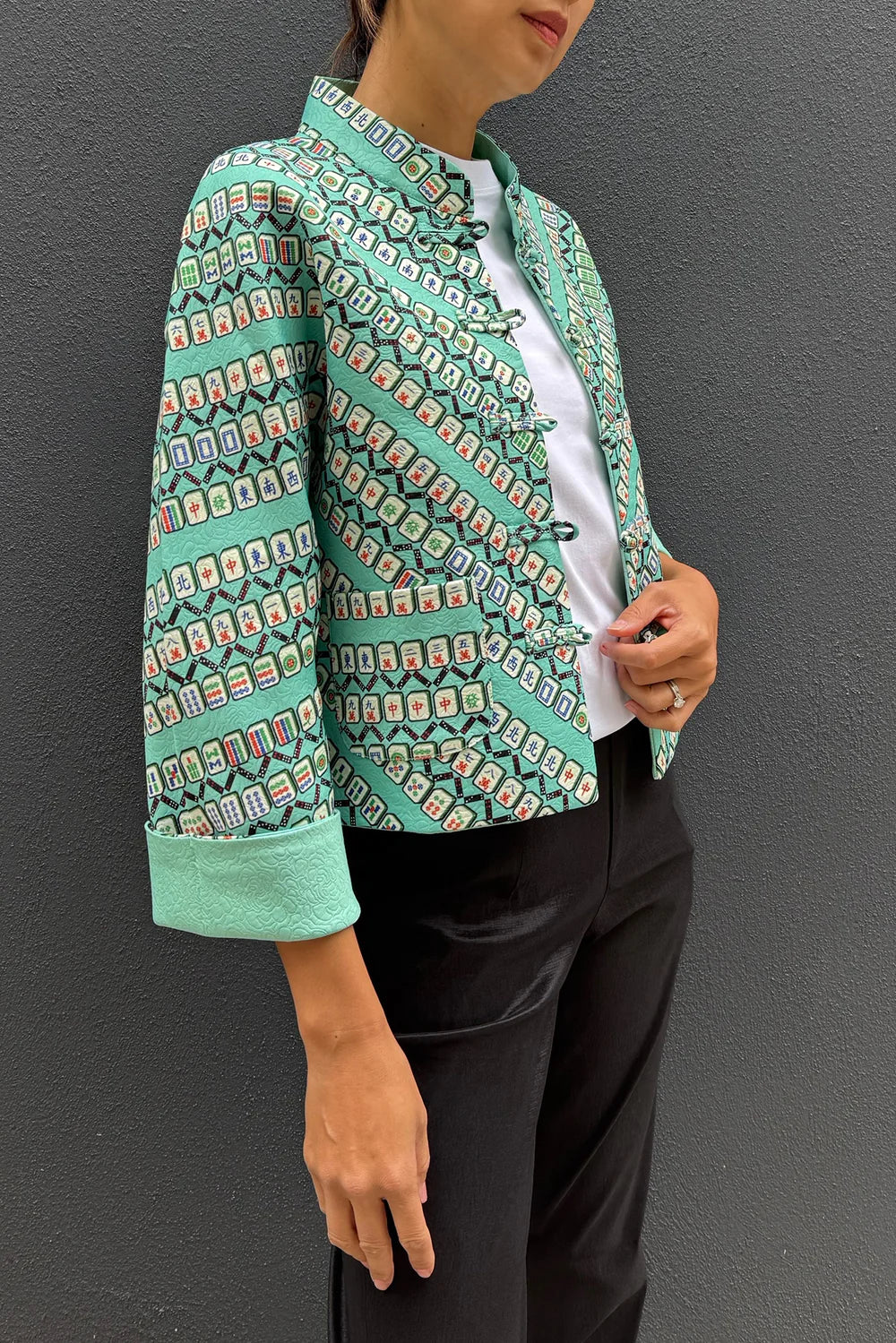 This is a REVERSIBLE jacket. One side Mahjong print and the other side plain green jacquard. Mahjong as the quintessence is printed on this traditional oriental jacket. The patterns are formed in all different kinds of winning hands. Handmade Chinese knot buttons at front as an oriental touch. You can create two different looks with one jacket!